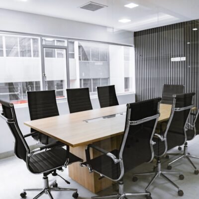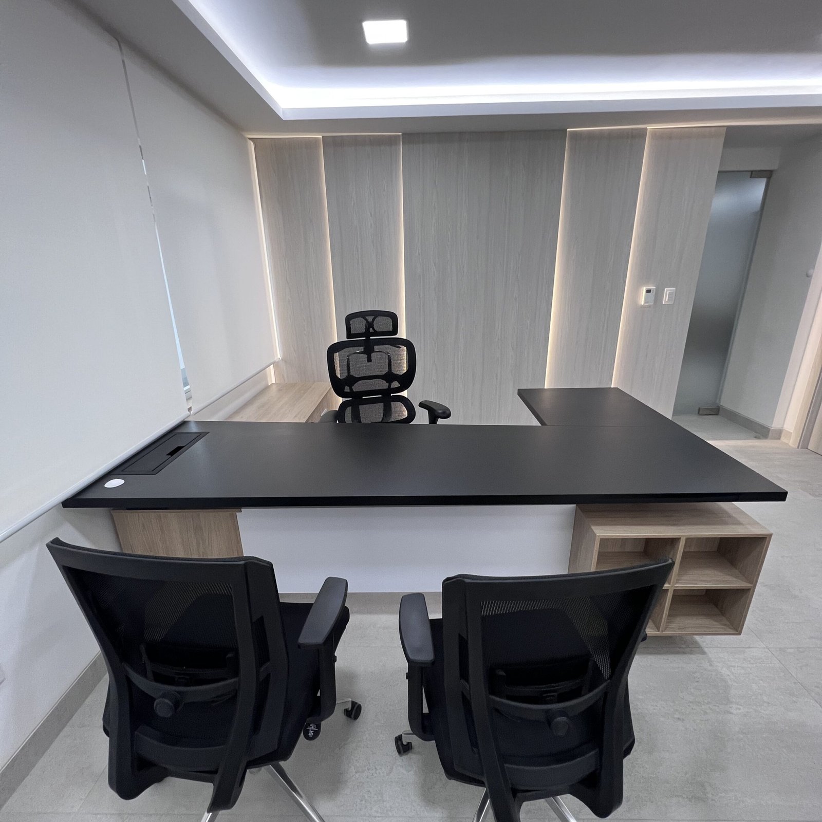 Cada área fue planificada con precisión: la sala de reuniones se diseñó para favorecer la claridad en la comunicación, con un mobiliario ergonómico y una mesa central equipada para trabajo colaborativo. Las estaciones operativas, con sus superficies amplias y divisores de vidrio, promueven concentración sin aislar al equipo. Finalmente, la oficina ejecutiva combina presencia y funcionalidad, integrando almacenaje a medida y una iluminación indirecta que realza la geometría del diseño.