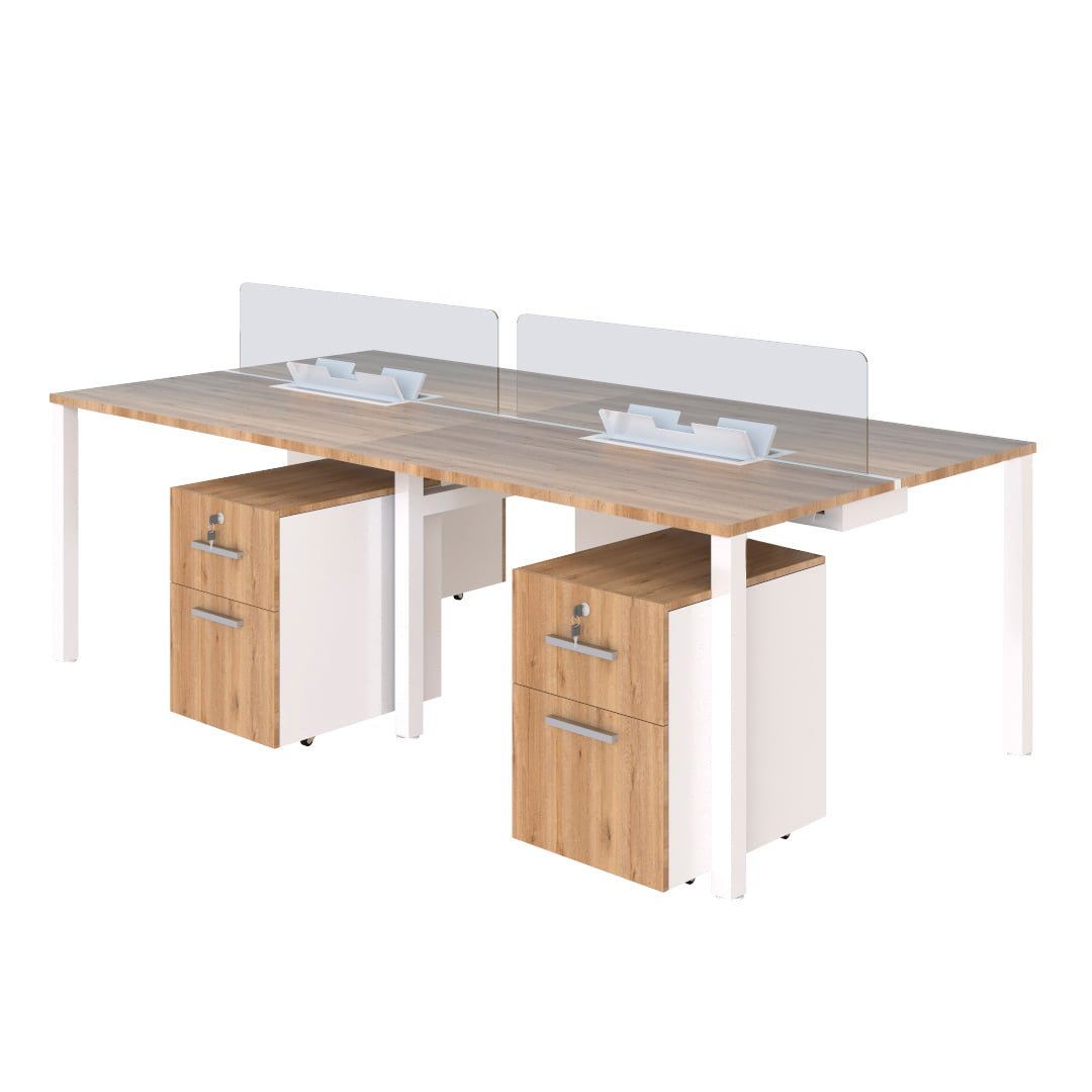 Estacion Coworking Ozono Para 4 Personas, con Panel Divisor de vidrio 6mm y accesorios.